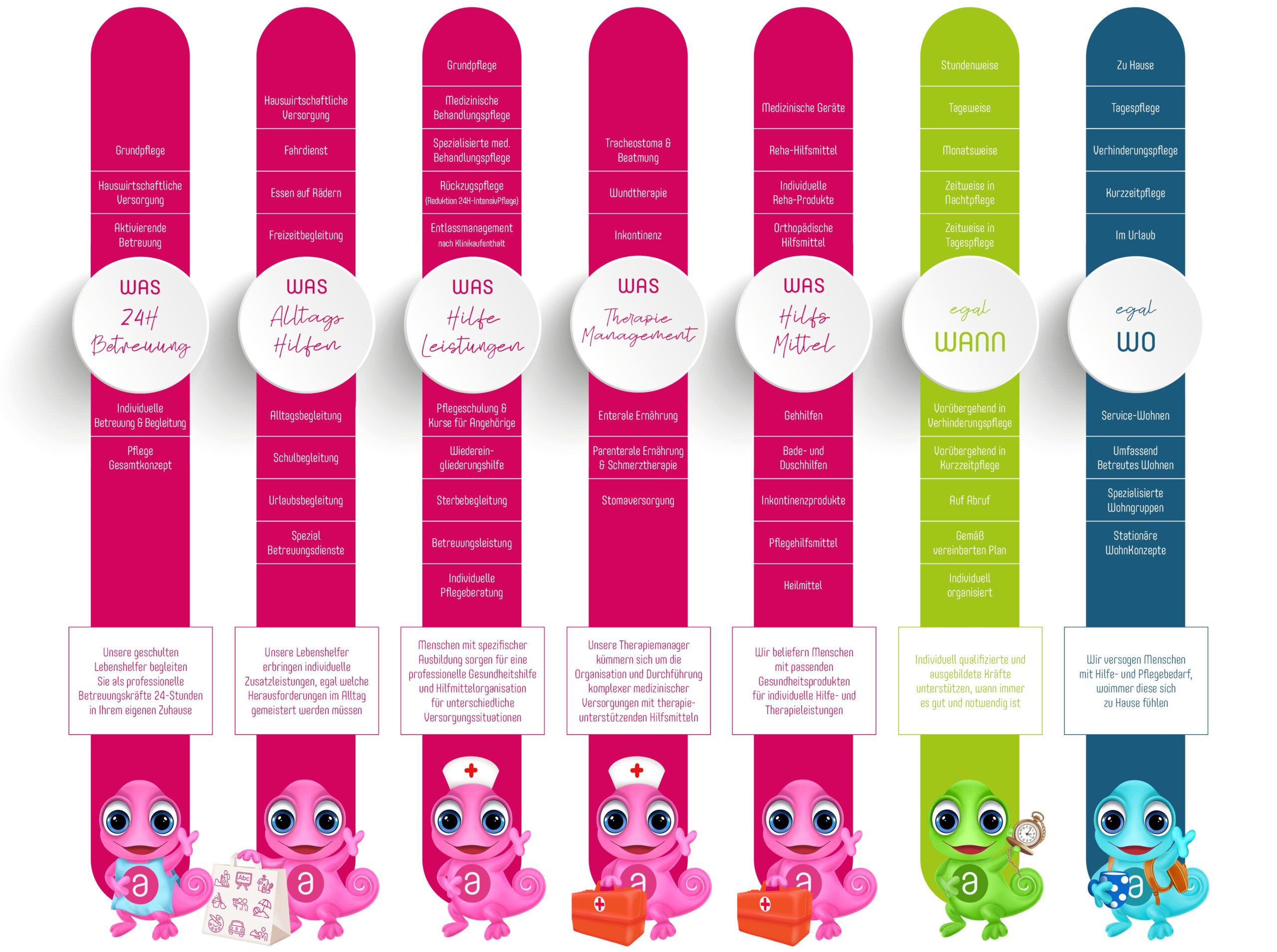 Mein Name ist Leon und ich bin ein CAREmeleon! Ich biete eine unglaubliche Vielfalt an professionellen Gesundheits- und Lebenshilfeleistungen an. Diese lassen sich genauso einfach und individuell an Menschen mit Hilfebedarf anpassen, wie ein Chamäleon seine Farbe ändern kann! Ich ändere sowohl meine Farbe als auch die Farbe meiner leuchtenden Kugeln, damit jeder immer genau erkennen kann, über welchen der Hilfebereiche von aiutanda ich gerade spreche und Informationen teile. So bin ich ein hilfreiches Leitsystem für eure individuellen Bedürfnisse.